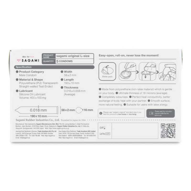 Polyuretánové kondómy sú pevné, a preto sú menej pružné ako latex. Ak vám je štandardná veľkosť kondómov Sagami príliš úzka, vyskúšajte tento rozmer L.