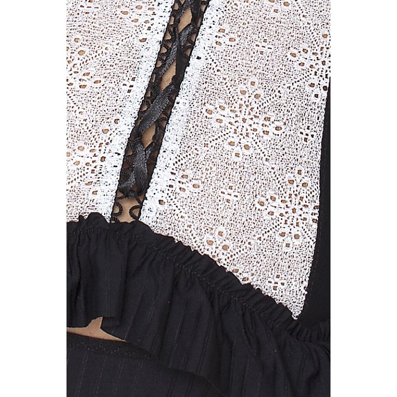 Čierny korzet s bielym čipkovaným vzorom. Vhodne doplnený nohavičkami.